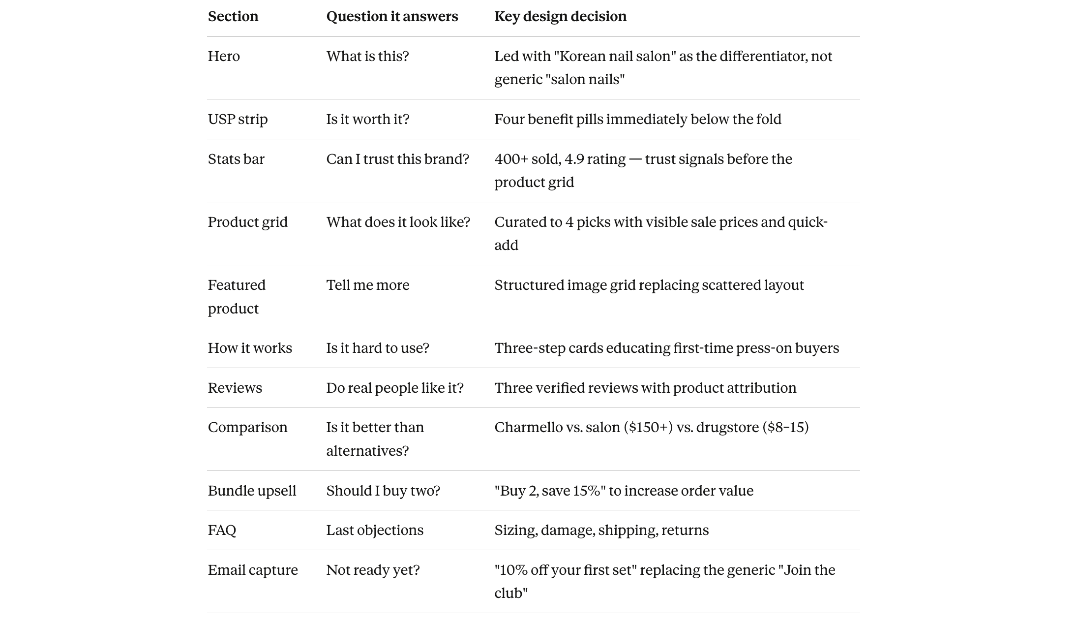Education is part of the funnel. A significant portion of potential customers have never used press-on nails or associate them with low quality. The how-it-works section and comparison chart exist specifically to bridge that knowledge gap and reframe the category.