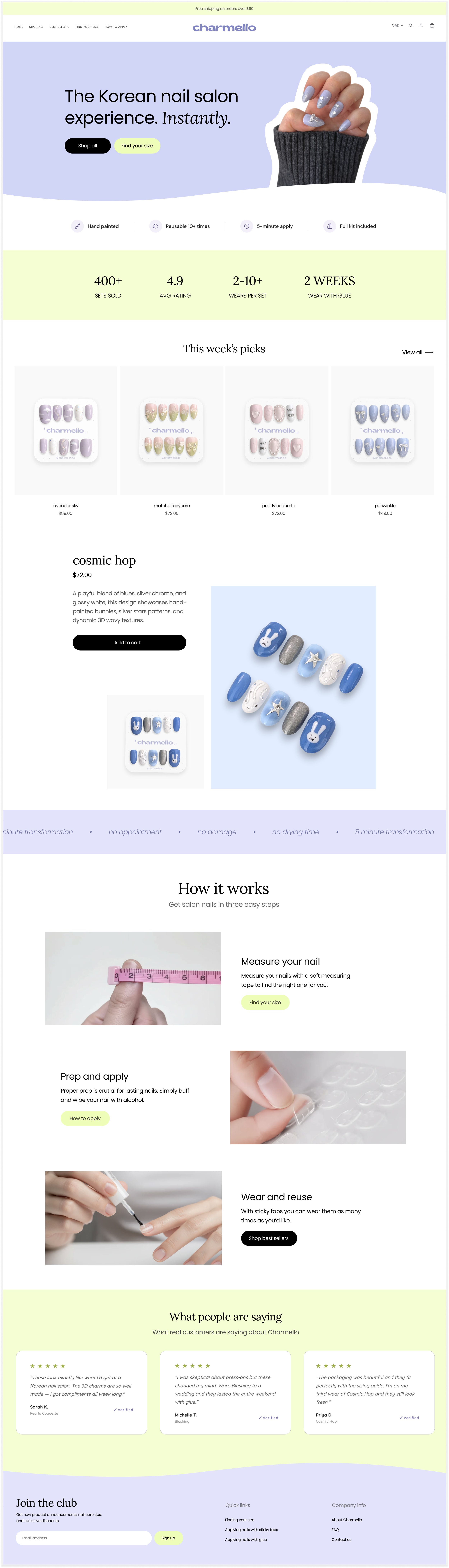 Charmello is a new Canadian DTC brand selling handmade Korean salon-style press-on nails. The original Shopify store had no clear value proposition, no social proof, invisible sale pricing, and AI-generated images on a handmade beauty product. Press-on nails also carry a category stigma — most people associate them with cheap drugstore sets, not $49–$72 hand-painted nail art. The site needed to both educate and convert.