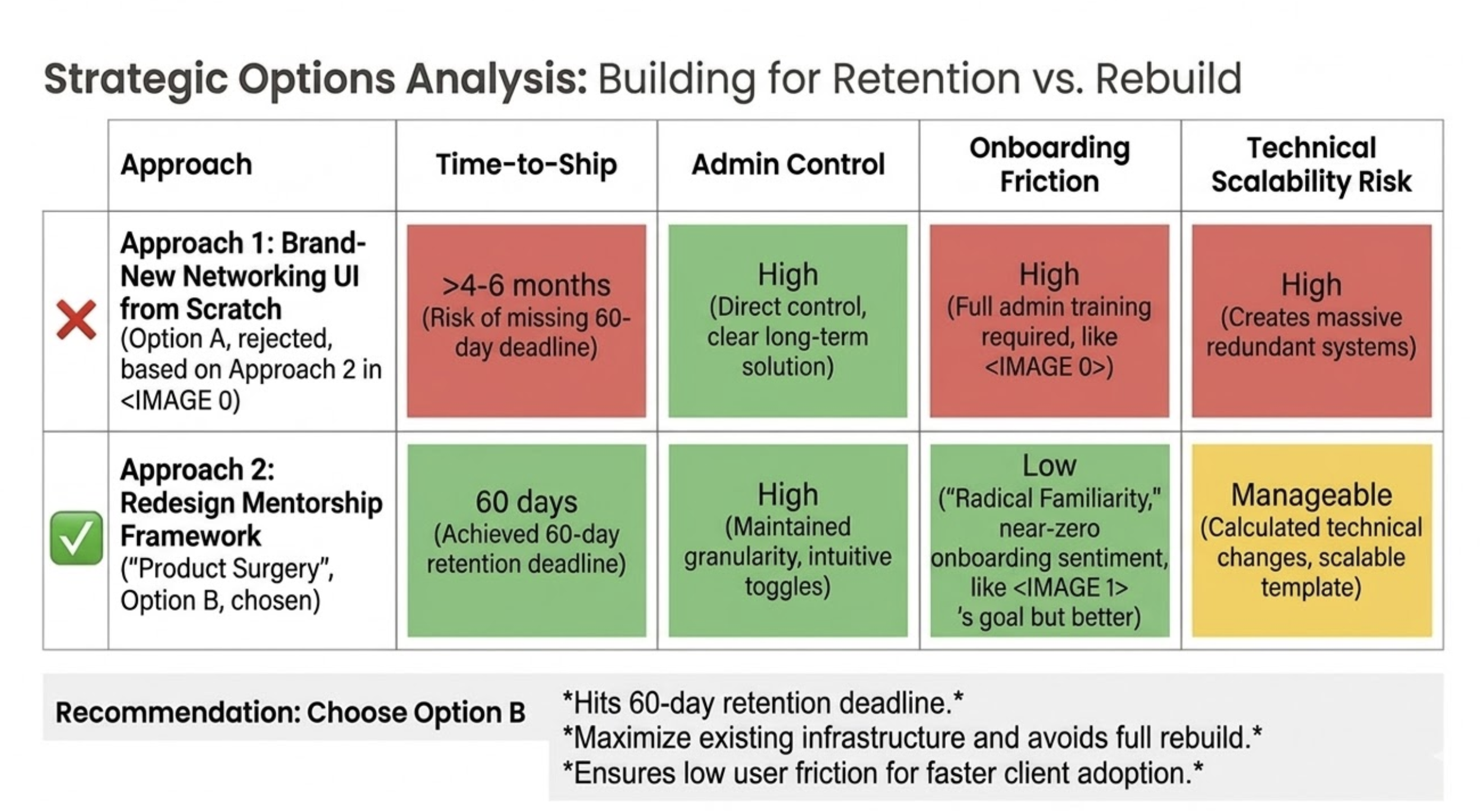 I advocated for Option B to the CTO. Based on my research, this wasn't just the faster route—it was the most scalable. By leveraging our existing Mentorship infrastructure, we could present a functional solution before the contract expired while creating a template that could be sold to future enterprise clients.